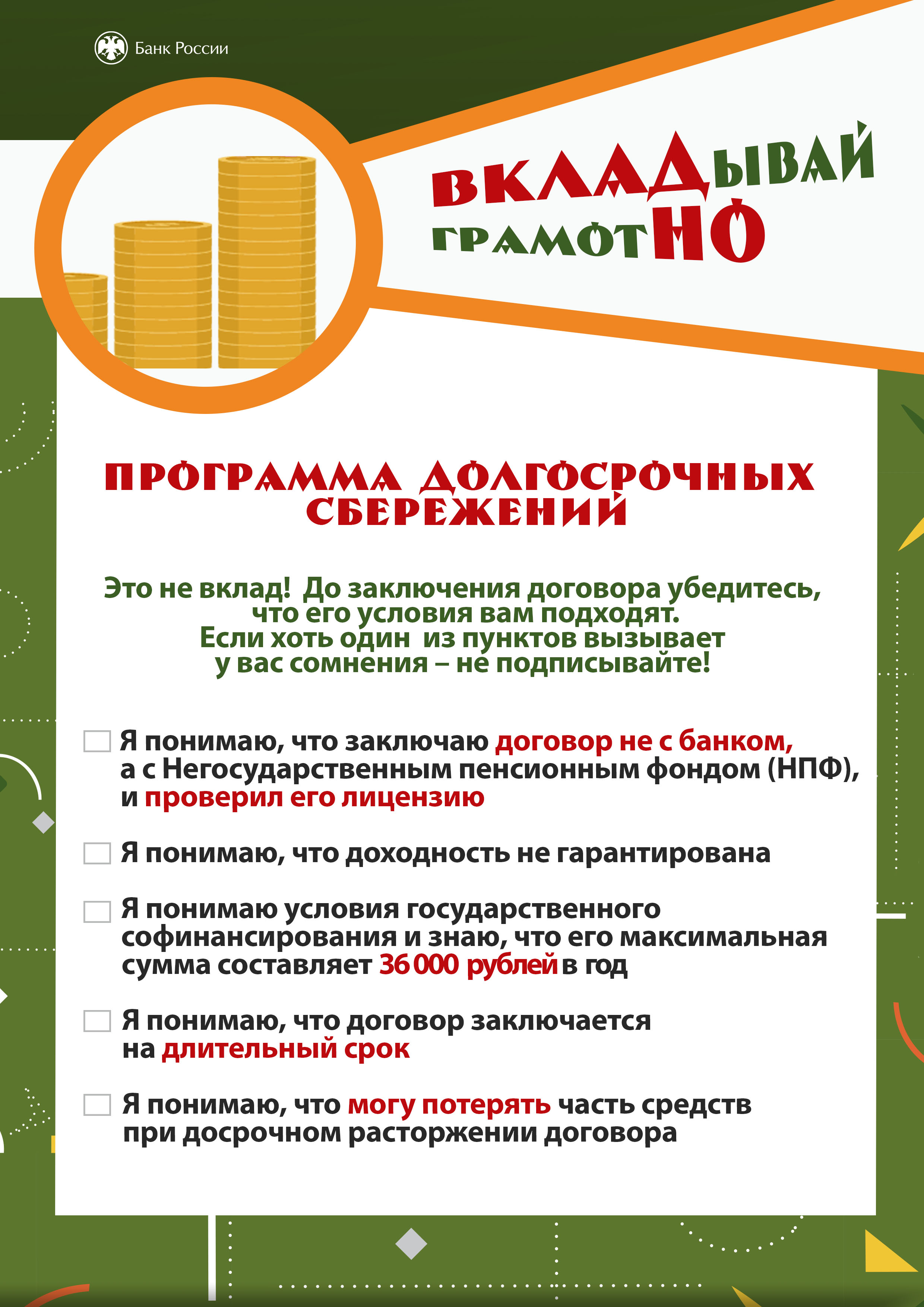 Программа долгосрочных сбережений – это добровольный сберегательный продукт для граждан с участием государства. Чтобы начать формировать сбережения, нужно заключить договор с любым из 29 негосударственных пенсионных фондов, которые являются операторами Программы. При желании можно заключить договор в пользу ребенка или другого человека. Воспользоваться накоплениями можно будет через 15 лет или при достижении возраста 55 лет для женщин и 60 лет для мужчин.